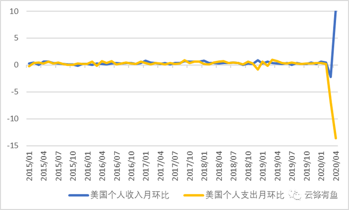 从美国个人消费来看,民众还是非常谨慎的。占美国GDP约2/3的消费者支出在4月创出历史最大跌幅。4月个人消费支出环比下降13.6%,是1959年有记录以来的最大降幅,而因为CARES法案发布,个人收入增长了10.1%,政府社会福利金增加了3万亿美元。
