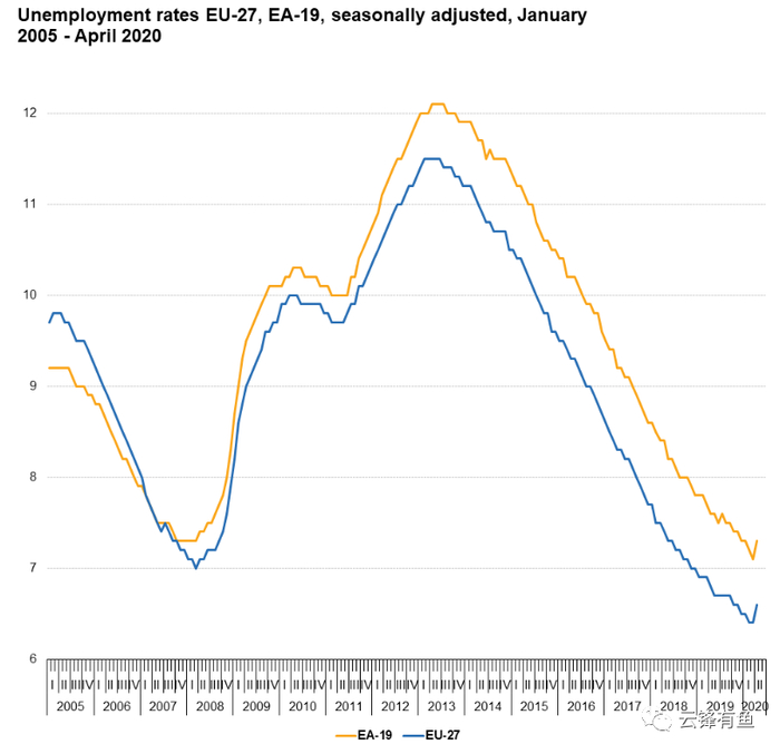 与此同时,失业率也大幅攀升,4月欧元区失业率7.3%,高于3月份的7.1%。
