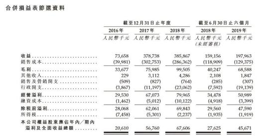 财务数据来看,2016至2018年该公司收益分别为7366万元、3.79亿元和3.86亿元,复合年增长率达到128.9%;纯利分别为2060万元、5680万元和6760万元。