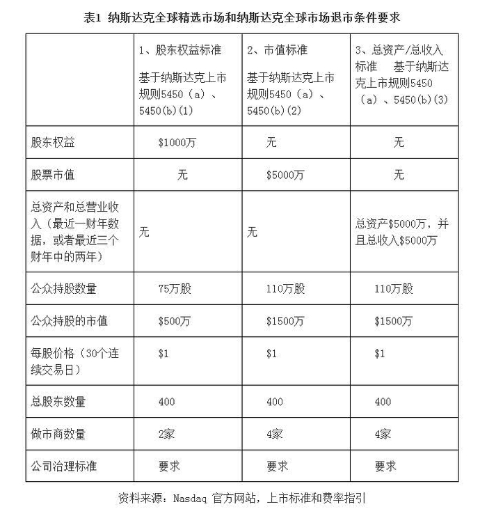 在纳斯达克全球精选市场和纳斯达克全球市场的已上市企业,如要继续挂牌,必须达到下列(表1)三组条件中的至少一组,否则,该企业将被退市。