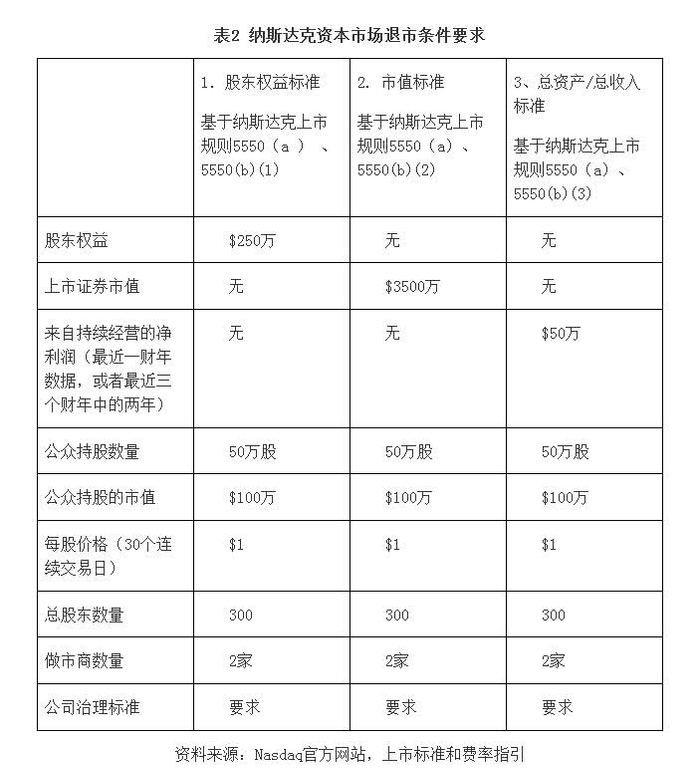 在纳斯达克资本市场上市的企业,如要继续挂牌,必须达到下列(表2)三组条件中的至少一组,否则,该企业将被退市。