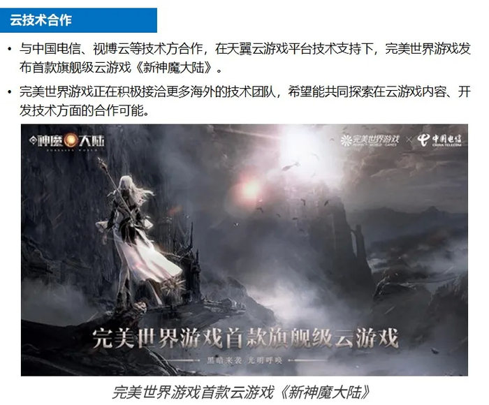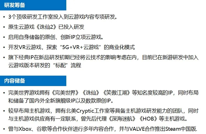 无论在端游主导时期还是移动游戏主导时期,完美世界游戏始终以精品化研发作为核心战略,随着云游戏到来,完美世界游戏在研发上的优势将得到放大。在当前阶段,完美世界游戏已做出多方面筹备以把握云游戏市场发展所带来的机会。在研发层面,完美世界游戏已布局3个顶级工作室基于其原创IP与创新IP筹备和研发原生云游戏;在产品方面,完美世界游戏同步进行现有游戏云化与原生云游戏制作,充分准备精品云游戏内容;在云技术与宣发方面,完美世界游戏通过与中国电信天翼云等电信运营商和平台合作,来实现云技术与分发渠道、形式的增强。由于云游戏可以无压力运行高品质游戏,在完美世界游戏的多方面筹备下,其精品内容储备与研发优势有望为其带来更高市场份额。