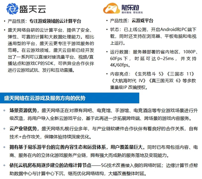 盛天网络在云游戏领域中主推云游戏平台以及云游戏算力池与服务解决方案。2014年,盛天网络布局云计算领域,通过云平台来升级场景服务技术,是国内较早立项云游戏服务的企业,目前盛天网络的云机房产品易乐游云服已经完成上线,随乐游云游戏平台正在公开测试中。盛天网络基于其经营沉淀,建立了丰富的场景资源优势,包括用户覆盖与产业链资源,而随着盛天云机房服务逐步覆盖,依托云机房建立自身边缘计算节点将在城镇形成高密度覆盖,助力其整个云游戏产业链的发展,未来市场表现可期。