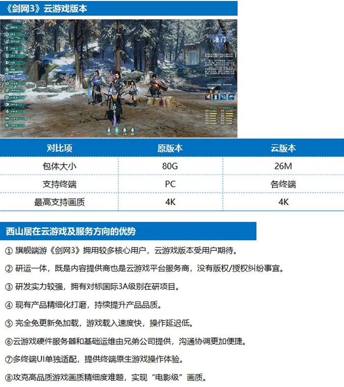 西山居较强的研发实力将在云游戏时期更大程度地转化为竞争优势。西山居在游戏研发上长期对标国际3A级产品,3D引擎早已实现自主化,公开数据显示西山居旗下重点产品《剑网3》上线10年累计更新已超2000次,画面与品质持续升级,显现了西山居对产品品质的执著,这也使得《剑网3》在PC端流水表现长期居前。此外,西山居目前仍然有《Code B.R.E.A.K.》等对标国际3A级产品的在研项目,未来随着云游戏的发展,解除用户设备要求桎梏,西山居的研发优势将进一步释放。而在云技术方面,西山居自研整个云游戏解决方案,金山云提供云游戏硬件服务器和基础运维,两家公司同属金山软件(03888)旗下,在技术落地方面协调更加便利,有助于相互促进从而助力西山居云游戏业务发展。