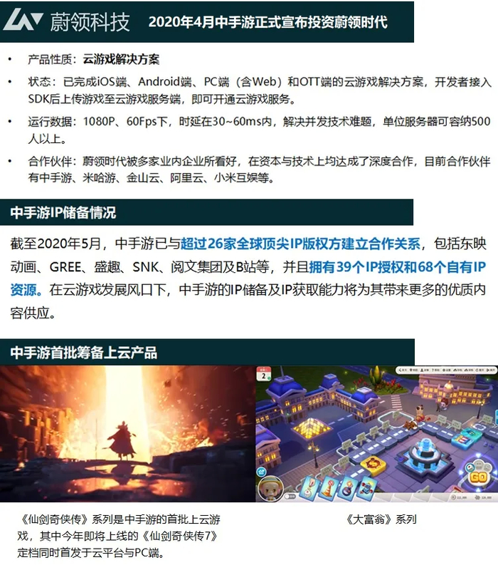 中手游选择投资已经在云游戏领域获得较高技术先发优势的蔚领时代来完善自身云游戏版块的布局。目前,蔚领时代在容器解决方案上已能够大大降低云游戏成本,以及解决并发的数量问题,蔚领的技术解决方案能够将公有云算力发挥到极致,以服务更多用户的方式摊薄公有云成本,这也使成本问题这一云游戏发展痛点得到有效改善。此外,随着云游戏发展必然带来的产品精品化升级与内容升级,中手游在版权获取与IP储备上的优势将进一步显现,基于此中手游也正在筹备原生云游戏的研发,以迎接云游戏发展带来的更多优质内容风口。目前中手游也在和盛天网络开展IP、技术方向合作洽谈。