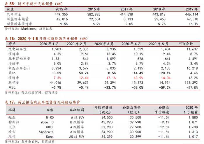 荷兰加码新能源车补贴政策,BIK逐年退坡的阶梯式税收优惠有望带动下半年荷兰新能源车抢装行情出现。荷兰目前乘用车年销量中枢约为45万辆,2019年新能源车销量达到6.7万辆,渗透率为15.1%。今年前五个月乘用车整体销量下滑27.8%,新能源车销量同比增长4.6%。从补贴政策上来看,荷兰于今年7月份开始会给予售价不超过4.5万欧元的纯电动车4000欧元的补贴,有望在今年下半年提振电动车销量。另外与英国情况类似,公司用车福利税BIK是荷兰给到电动车的一项非常重要的优惠政策,2020年4.5万欧元以内车价部分可享受14%的税收优惠,按照40%的个税税率计算,节税金额可达2,500欧元,并且荷兰是实施逐年退坡的阶梯式税收优惠,以往年经验来看每年接近年底荷兰的新能源车市场都会出现一波抢装行情,政策带动之下,今年下半年荷兰新能源车市场的表现值得期待。