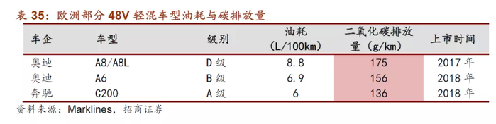 降低交运部门碳排放是控制排放总量的重要途径。交通运输部门是欧盟二氧化碳重要的排放源,近年以来欧盟交运部门碳排放占比仅次于发电供热,在25%左右,因此降低交运部门碳排放是减少温室气体排放总量的重要途径。欧盟严格制定交运部门碳排放政策,已对新注册乘用车碳排放量提出具体要求。2019年4月欧盟理事会通过欧盟汽车和货车二氧化碳排放新标准:2020-2025碳排放不高于95g/km,2025-2030年碳排放不高于80.8g/km。2020年-2025年和2025年-2030年的碳排放目标对应的油耗分别为4.1L/100km和3.5L/100km,目前欧洲车企降低油耗常用的方式为提高内燃发动机的工作效率和采用48V微混系统,油耗降低的空间为10%-15%,目前欧洲的平均油耗水平约为5L/100km,通过优化发动机和48V微混系统可以帮助主机厂在2020年-2025年的考核时间段内完成碳排放要求,但是在2025年-2030年碳排放标准进一步趋严之后,纯电动车和插电混动车型将成为各大主机厂发展的战略重点。