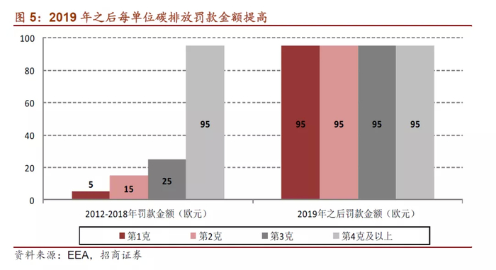 碳排放检测工况由NEDC变为更加严格的WLTC。欧洲此前将NEDC(新欧洲驾驶循环)作为碳排放检测标准,2019年9月后 WLTC(世界轻型车测试循环)标准取代NEDC。从测试周期、涵盖速度范围、与实际路况匹配度等方面来看,WLTC更贴近实际行驶情况,比NEDC更为严格,相同车型在WLTC标准下碳排放量将增加20%左右。与此同时碳排放超标的罚款金额大幅提高。欧盟相关法律规定未达到碳排放检测标准的的车企单车罚款金额为每额外一单位碳排放(g/km)95 欧元,此前规定为超标的第1-4(及以上)单位碳排放处罚金额分别为5、15、25、95欧元。