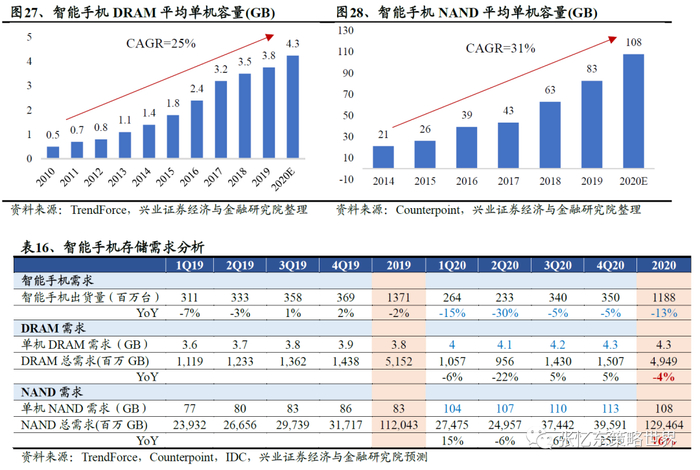 手机容量规格提升,预计全年内存/闪存位元需求增长-4%/16%。智能手机占整体手机出货量70%以上,容量规格也远大于功能机,本文以智能手机需求进行分析。我们判断20年全球智能手机存储规格提升(智能手机DRAM/NAND单机容量CAGR约为25%/31%),预计全年智能手机内存/闪存位元需求将增长-4%/16%。