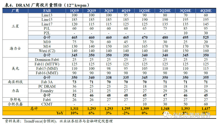2020年DRAM投片量预计同比增长11%,位元供给增长主要由制程升级驱动。DRAM价格自2019年底开始企稳,但主要厂商的投片量尚未显著扩张,预计今年整体DRAM投片产能仅个位数增长,行业的资本支出也将持续下降。三大DRAM原厂的产能概况及预估如下: