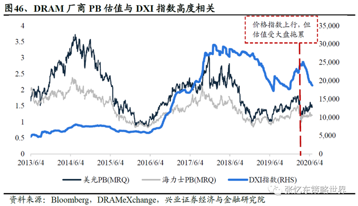 海力士和美光作为主营内存的存储厂商跟随估值呈周期性波动。美光PB跟随存储价格呈3-4年周期变化,在2Q19末达到了PB估值低位1.0x,对比前两次上行周期估值顶点3.6x(3Q14)与3.0x(4Q17),同期海力士达到2.3x与2.0x,目前美光与海力士PB估值都接近1.4x,处于周期低位,主要是因公共卫生事件蔓延带动市场整体下挫。目前DXI指数(DRAM综合价格指数)从2019年底以来也持续走高,目前估值相对周期高位仍有较大的提升空间,未来随着存储价格回升,行业估值中枢有望逐步上移。
