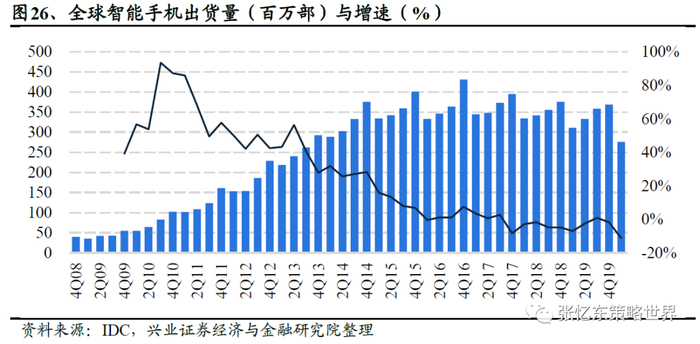 智能手机预计出货量同比下滑13%。全球智能机20Q1出货量2.6亿部,同比下滑15%;20Q2供应链复工状况改善,但海外销售渠道受到严重冲击。我们判断四个季度同比增长分别为:-15%、-30%、-5%、-5%,全年预计销量达到约11.8亿只,下滑约13%,其中5G手机渗透率约16%。