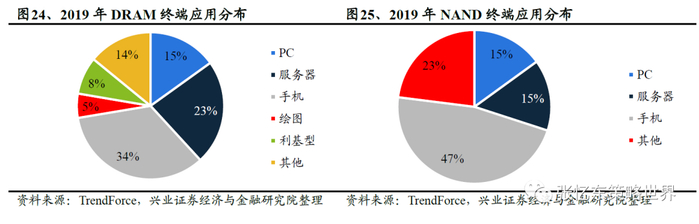 PC、服务器与手机为存储三大终端应用,占据7成以上。TrendForce估算,PC、智能手机、服务器三者在2019年的位元需求占比,DRAM基本在83%-85%,NAND基本在75%-77%。手机、服务器、PC分别占DRAM的终端应用41%、32%、13%,以及NAND Flash的47%、15%、15%。