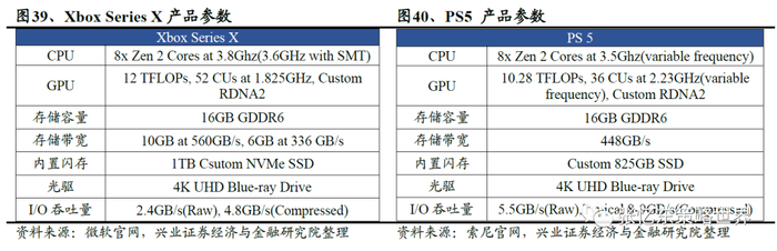 显存配置将由DDR4升级为DDR6,硬盘也从HDD更换为512GB以上的SSD。根据微软与索尼的官方信息,两台主机都将采用目前最先进的GDDR6,PS5的内存预计高达16GB(PS4 8GB),XboxSeries X将采用16GB与12GB二种(Xbox One X 12/8GB)。SSD的增量需求预估将占2020年全球市场份额的3-5%。PS5与Xbox Series X将改采固态硬盘作为存储设备,将会采用至少512GB以上甚至1TB的容量来满足未来游戏需求(PS4和Xbox One X皆为1TBHDD)。游戏机的SSD需求预估将占2020年全球SSD市场份额的3-5%(集中在Q4出货),2021年将进一步大幅成长。Sony与Microsoft预计下半年进入采购备货周期。