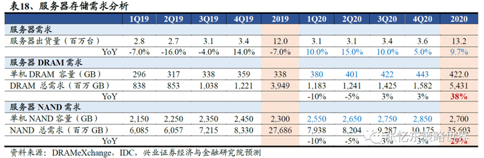 2020年全球DRAM/NAND需求增长约14%/15%。人工智能等场景的算力需求增长、数据中心补库存和硬件迭代的背景下,服务器存储芯片有望成为整体存储市场复苏的重要支撑。结合TrendForce预测,我们判断2020年全球DRAM/NAND需求增长约14%/15%,若公共卫生事件在三季度无法好转,则增速或降低约5ppts。