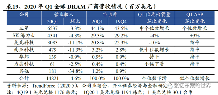 三大原厂20Q2展望乐观,二季度环比或持续增长。20Q2市场需求的重心仍在平板、笔电及企业级 SSD,三大原厂皆判断远程教学与办公将稳健带动二季度服务器与PC需求,对冲智能机的需求下滑。美光FY20Q3(2020.03-2020.05)业绩营收54亿美元,超过指引上限(指引为52-52亿美元),QoQ+13.4%,YoY+13.6%。Non-GAAP净利润为9.41亿美元,QoQ+82%,YoY-21.5%。公司对下季度指引乐观,预计营收为57.5亿美元-62.5亿美元,QoQ+10%,YoY+23%。