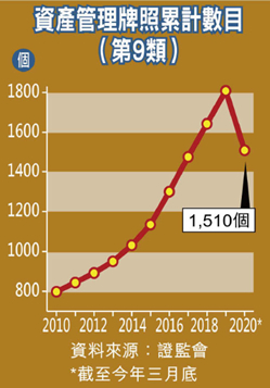 近年证监会发出的牌照中,资产管理牌(9号牌)的累计发牌数目不断超越证券交易牌(1号牌),至一四年底,9号牌数目破千,为1,031个,已较1号牌数目973个为多。而截至今年三月底,9号牌的累计发牌数目为1,510个,较1号牌的1,259个为多。
