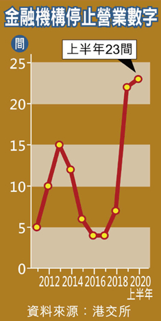加上近年网上证券行大行其道,传统小型证券行几无生存空间。按香港交易所(00388)网站数据,2015至2018年,每年停止营业的金融机构数目只有单位数字,至2019年却急增至22间,而今年仅上半年便有合共23间金融机构停止营业,数目超越去年全年。