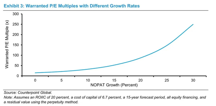 图三显示了增长和P/E倍数的关系是凸性的。预期增长率的小幅变化就可以导致P/E值的很大变化,尤其是增长率很高时。