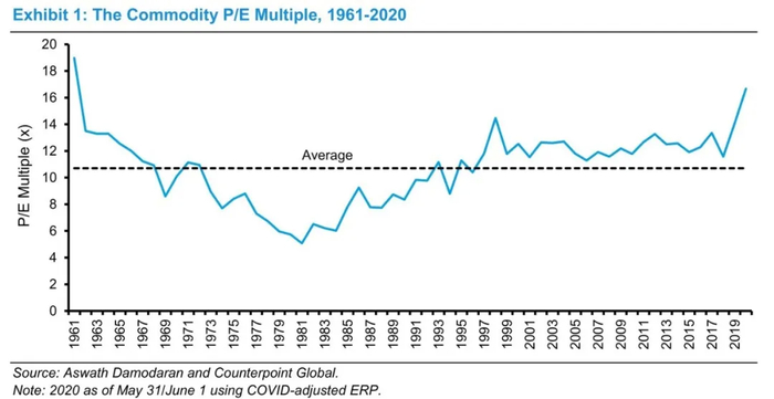 权益资金成本从而通用P/E倍数(commodity P/E multiple)的变动是因为无风险利率和股权风险溢价的变动。图一展示了通用P/E倍数(commodity P/E multiple)从1961年到2020年5月间的情况。这些倍数是基于Aswath Damodaran估测的股权风险溢价计算而来的,Damodaran是纽约大学Stern商学院在估值方面的优秀的专家。