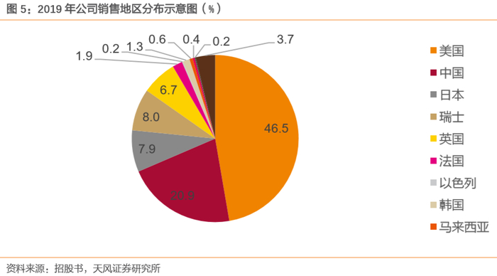 公司国内外客户资源丰富,产品已销往50多个海外国家。公司目前主要营收由面向企业客户的代工业务贡献。由于新型烟草的市场及客户基本分布在海外国家和地区,因此公司的大部分业务是面向海外国家市场,主要包括美国、日本、及欧洲等国家和地区,截至2019年,出口美国占总营收比例为46.5%(包括香港转运部分),海外市场占比为79.1%,中国占比为20.9%。