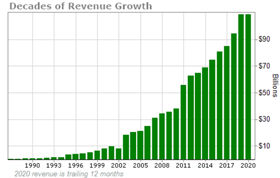 该公司在过去数十年来仅出现过一次销售萎缩,即2002年。即便是在金融危机期间,该公司在2009年的营收也增长了3%。