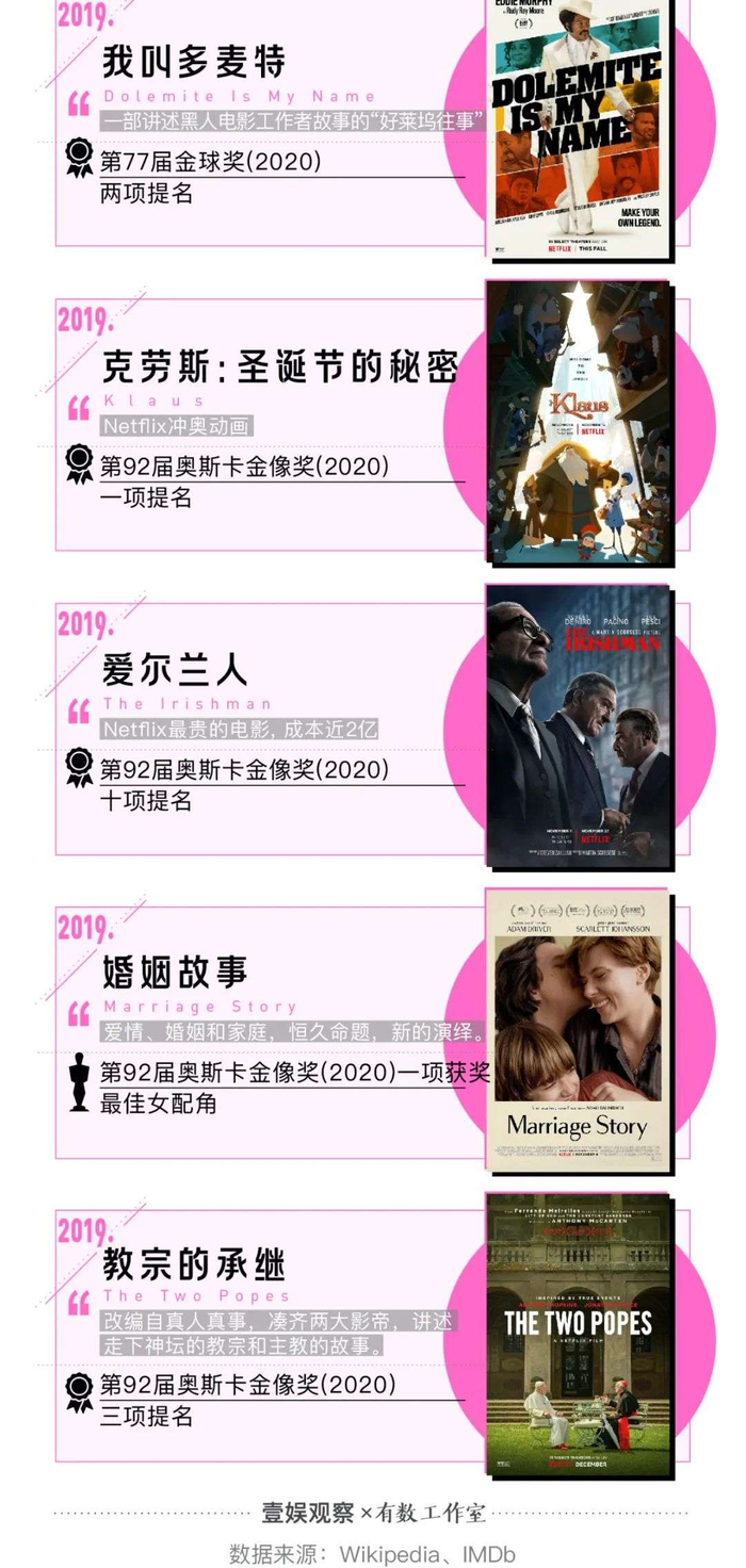 Netflix斥巨资1.59亿美元打造史诗作品《爱尔兰人》,聚集斯嘉丽·约翰逊等一线红星出品中 产阶 级电影《婚姻故事》,宗教电影《教宗的承继》,黑人传记电影《我叫多麦特》等,只为迎合奥斯卡口味,据网 传消息,Netflix为了造势,颁奖季期间花费了近1亿美金用于宣传。