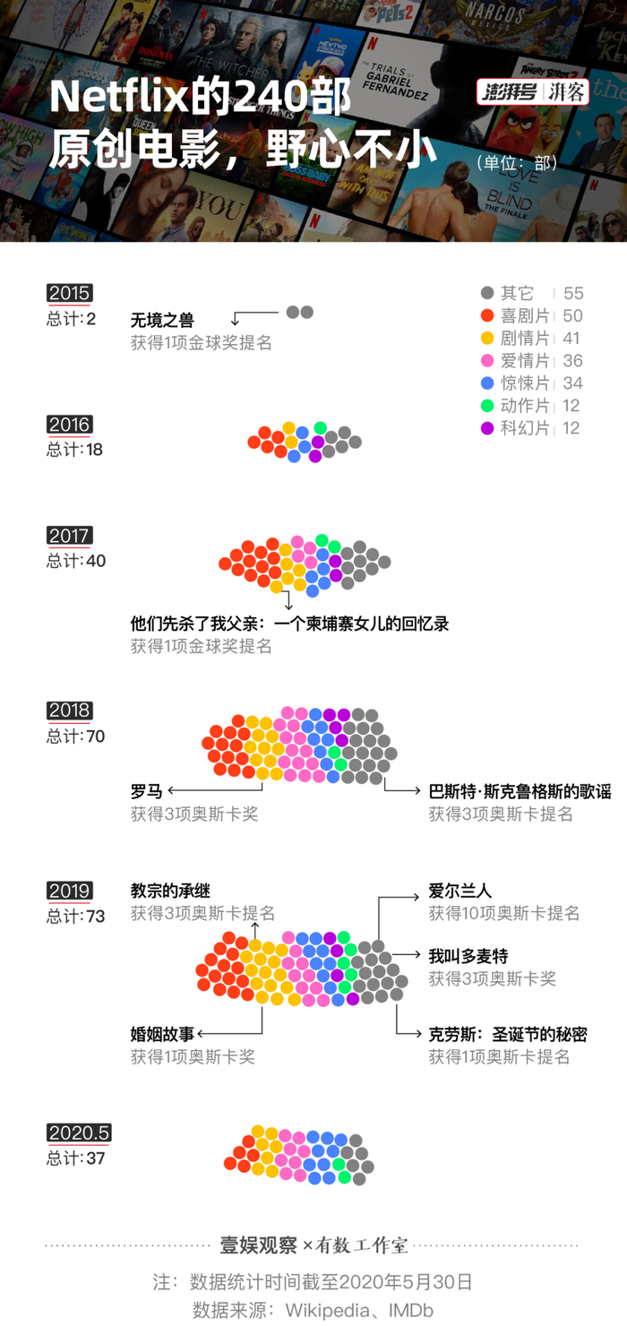 根据“澎湃号|有数工作室”整理数据显示,自2015年至今年5月,Netflix累计创作了240多部原创电影。