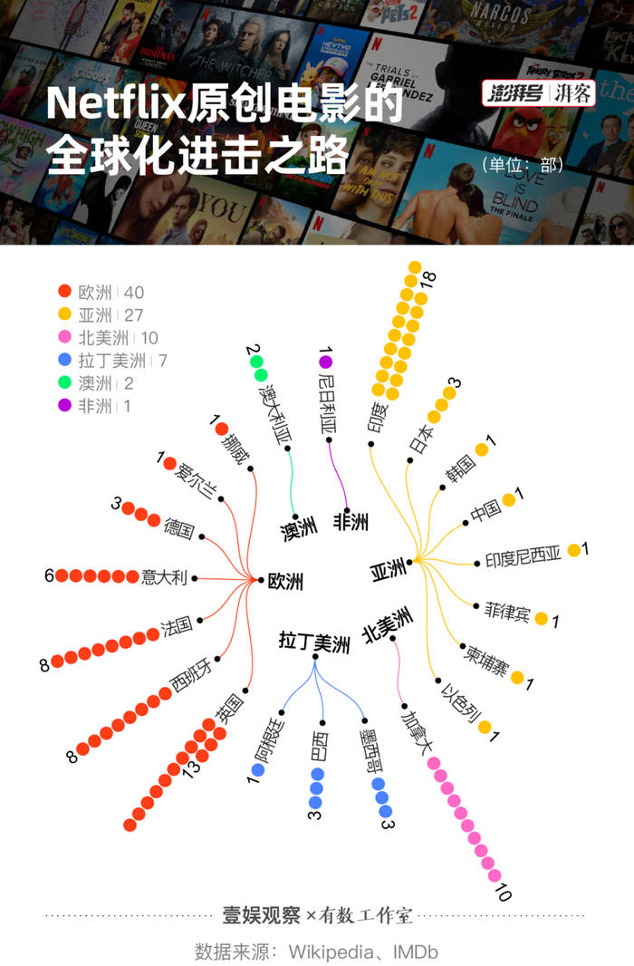 据统计,五年间与Netflix联合出品原创电影的国家和地区有21个,累计共有87部原创电影,超过原创电影总数的3分之1。其中,欧洲40部,亚洲27部,二者为主要合作地区。最多合作的国家是印度的18部,其次是英国的13部,加拿大10部,西班牙8部,组成主力军。