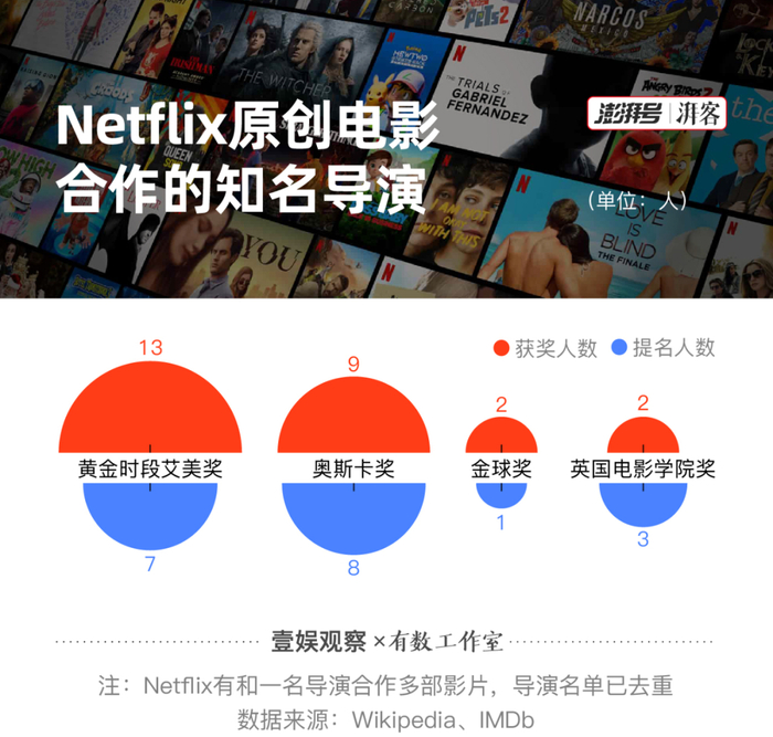 在Netflix合作的电影导演中,也多数聚焦在擅长文艺片的名导。240部作品中,有45名导演拥有奥斯卡、金球、英国电影学院等国际奖项光环,如马丁·斯科塞斯、科恩兄弟、阿方索·卡隆等,同时还与全球青年才俊导演保持密切合作,以保证头部精品内容创新力。