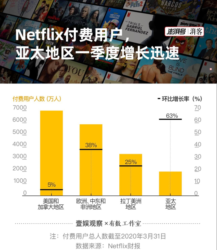 截至2020年4月(第一季度财报),Netflix在全球拥有1.82亿付费订阅用户,其中北美地区达6997万,同比去年增速仅5%,趋于饱和。欧洲、中东和非洲地区达5873万,增速38%、拉丁美洲3432万元,增长25%,稳步增长。而亚太地区虽因文化差异、设备基础等原因虽为最少的1984万,却迎来了63%高速增长。