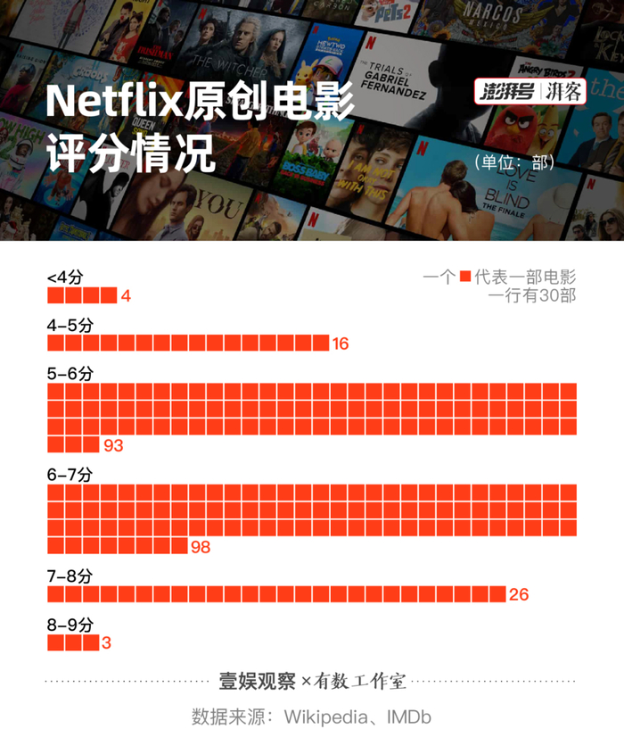 根据“澎湃号|有数工作室”整理数据显示,240部Netflix原创电影在IMDB的评分中,8~9分经典作品以《爱尔兰人》为首只有3部,7~8分精品内容有26部,及格线以上作品达127部,超过半数。但同时,也有近半数的烂片作品,包括4部4分以下的史诗烂片,如今年的《美国最后一宗罪案》,烂番茄新鲜度0%,被“奉为”史上最烂。