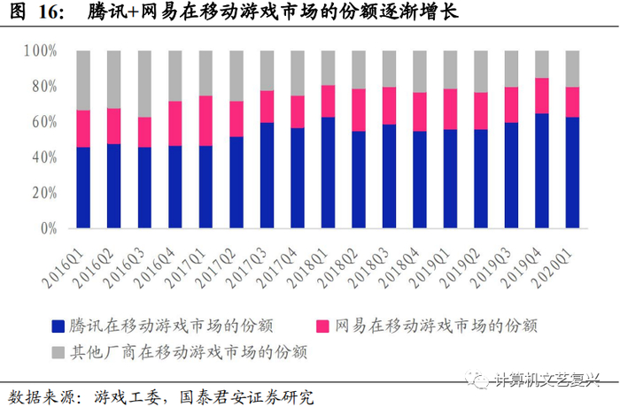 国内的游戏产品研发市场呈现“二超多强”的格局。即腾讯(00700)和网易(09999)两家公司领跑游戏市场,市场份额近七成,而“多强”的代表为完美世界、欢聚时代、三七互娱、世纪华通等。腾讯和网易两家厂商不仅深耕PC端游戏,还早已进入手游市场,打造了许多手游爆款,占据了近80%的市场份额。两家游戏厂商具有非常丰富的游戏研发、分发、运营经验,有着强大的号召力,并且可以凭借巨大的市场份额来获取在游戏产业链中的话语权。