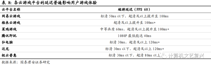 云游戏延迟明显,造成玩家游戏体验较差。实验室针对1080P、144帧云游戏进行流化时延测试,发现当云游戏流化时延超过10ms时,准电竞级选手反馈体验下降;当流化时延超过 30ms 时,普通电竞玩家明显感受到音画不同步等现象。而现阶段众多云游戏平台的时延并不能做到30ms以下,若达到高清及以上的画质,或将忍受近100ms以上的延迟,进而严重影响用户游戏体验。