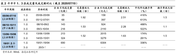 借鉴历史,这次牛市3浪期间成交额均值有望达1.5万亿。回顾历史,牛市3浪中的日均成交量是1浪的1.5-1.9倍,日均成交额是1.6到2.5倍。具体看历次牛市:05/06-07/10牛市,用上证综指刻画,牛市1浪上涨期间是05/6-05/9,3浪上涨期间是05/12-07/1,全部A股日均成交量从1浪期间的35亿股上升至3浪期间的68亿股,日交易量放大1.9倍;日均成交额从158亿上升至397亿,日交易额放大2.5倍;平均年化换手率从416%升至613%,换手率放大1.5倍。08/10-10/11牛市,由于上证综指在09/8-10/11之后持续高位震荡,这轮牛市的第三阶段领涨板块转到中小板,我们用中小板指来刻画。这轮牛市1浪上涨期间是08/10-09/2,3浪上涨期间是09/3-10/4,全部A股日均成交量从1浪的143亿股上升至3浪期间的218亿股,日交易量放大1.5倍;日均成交额从924亿上升至2110亿,日交易额放大2.3倍;平均年化换手率从488%升至522%,换手率放大1.1倍。13/06-15/06以上证综指刻画的牛市期间,牛市1浪上涨期间是13/6-13/9,3浪上涨期间是14/3-15/1,全部A股日均成交量从1浪期间的213亿股上升至3浪期间的324亿股,日交易量放大1.5倍;日均成交额从2015亿上升至3279亿,日交易额放大1.6倍;平均年化换手率从174%升至261%,换手率放大1.5倍。本轮牛市1浪期间全部A股日均成交额约为6300亿元,借鉴前几次牛市经验,本轮牛市3浪期间日均成交额有望达1.5万亿元上下,行情最热时日成交额可能会接近2万亿。
