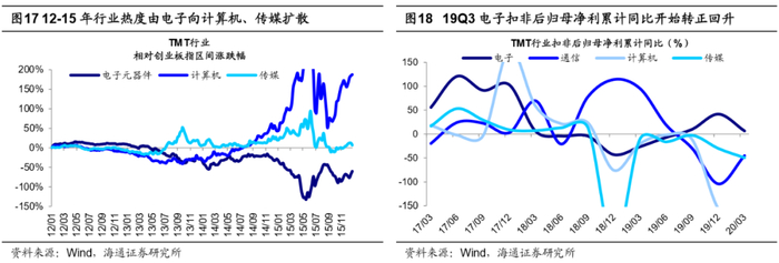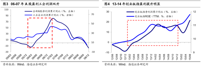 牛市3浪上涨背景是基本面回升,戴维斯双击。牛市是一个感性的认识和模糊的概念,金融学并没有严格的定义,我们认为,牛市的核心是赚钱效应强,表象特征是指数涨、大部分股票上涨、场外资金进场。我们在前期报告《牛市有三个阶段-20190303》中提出牛市可以分为孕育期、爆发期、泡沫期,它们的特征差异十分明显。孕育期(对应波浪理论的1浪上涨+2浪回调)主要表现为盈利回落、估值修复。这一阶段宏观基本面仍在下行,企业盈利增速回落找底中,但宏观政策已偏暖,流动性好转,估值修复推动市场上涨。市场进二退一,回吐较大,为牛市爆发做准备。爆发期(对应波浪理论的3浪上涨+4浪回调),基本面出现拐点,企业盈利触底回升,盈利和估值均上行,形成戴维斯双击,牛市全面爆发,此阶段市场涨幅最大,所以牛市3浪通常称为主升浪。疯狂期(对应波浪理论的5浪冲顶),企业盈利增速已趋于平缓,失去爆发期的加速度,但以散户为代表的增量资金仍在加速进场,推动市盈率走向市梦率,构筑市场泡沫,形成最后一冲。A股最近三轮牛市(05/06-07/10、08/10-10/11、12/12-15/06),均可以划分以上几个阶段,详见前期报告。进入牛市3浪都是源于基本面数据回升,如05-07年牛市,06/1进入牛市3浪上涨,这一时期基本面企稳回升,工业增加值累计同比从06/01的12.6%上升至2月的16.2%,随后升至07/03的18.3%,工业企业利润累计同比从06年2、3月21.8%、21.3%升至4月22.1%,随后升至07/02的43.8%,全部A股归母净利润同比增速06Q1见底于-14.0%,06Q2升至7.4%,07Q1升至80.7%。如12/12-15/06的创业板指代表的牛市,13/4创业板进入牛市3浪上涨,创业板指净利润同比增速从12Q4的-9.4%反转升至13Q2的1.6%,随后升至14Q4的16.5%。