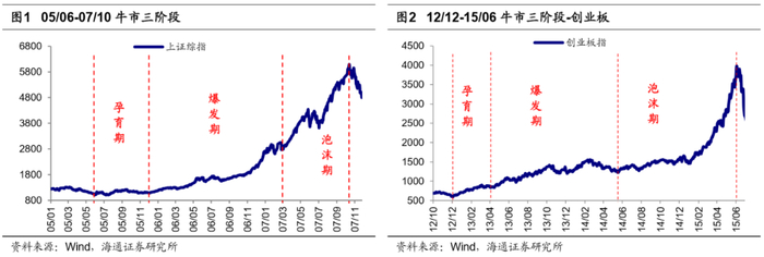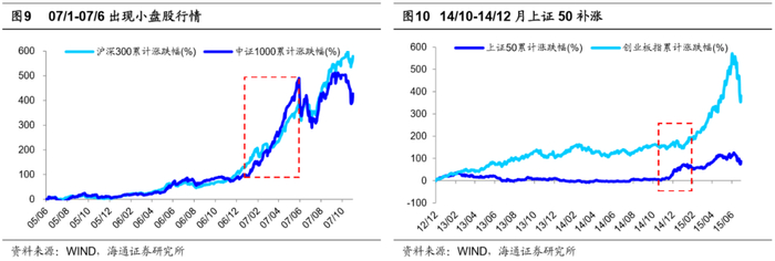 回顾历史,牛市主线与轮涨并不矛盾。历史经验表明,每轮牛市中均会出现对应的主导产业,详见《牛市第二阶段什么行业最强?20190730》。牛市孕育期市场进二退一,回吐较大,行业以轮涨普涨为主,整体是中枢抬升的震荡。而牛市爆发期进入盈利驱动阶段,行业间分化也是以盈利为基准,盈利上升陡峭行业往往涨幅居前,进而形成主导产业,主导产业具有业绩和估值提升明显的特征。结合基金持仓市值占比,我们发现基金在行业配置上更加青睐主导行业,助推主导行业在牛市爆发期即3浪上涨阶段表现更强。例如,05-07年受益于加入WTO和房地产新政,城镇化和工业化加速,05/06-07/10牛市3浪阶段主导产业是以固定资产投资为主的地产产业链;12/12-15/06牛市3浪阶段主导板块是以创业板为代表的科技股,主导产业链是计算机、传媒等TMT行业。根据历史经验,牛市期间会出现主导产业,盈利是其决定变量,但在主线上涨过程中,也会出现其他行业的阶段性轮涨行情,牛市中主线与行业轮涨并不矛盾,我们在《对比历史,看行业分化-20200628》中分析过。例如05-07年的牛市虽然以地产银行为代表的大盘蓝筹股占主导,但在07年1-6月也出现了一轮小盘股行情,在此期间以中证1000为代表的小盘股区间涨幅最大达到113%,同期沪深300区间涨幅最大为84%;12/12-15/6牛市以TMT为代表的成长股为主导行情,但在14年10-12月也出现了金融地产为代表的价值股修复行情,在此期间上证50涨幅59.4%,同期创业板指跌幅-4.5%。由此可见,牛市在主线上涨过程中也要注意其他行业轮涨。