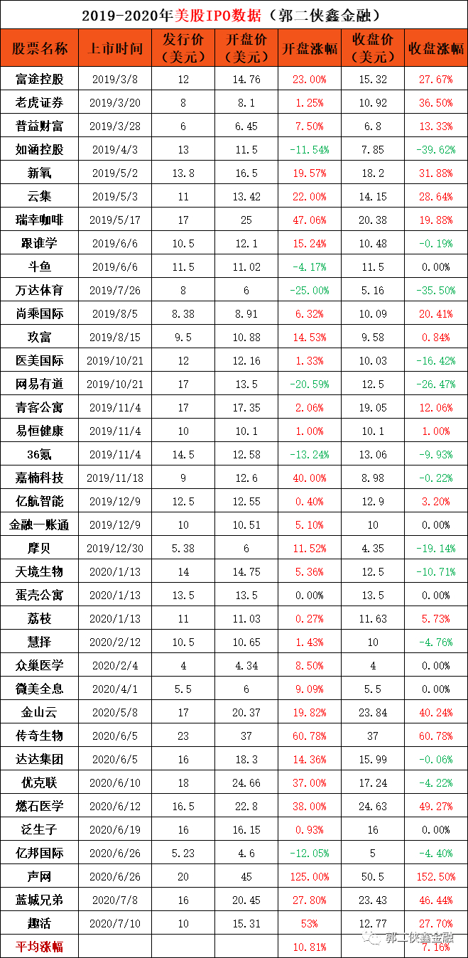 3、中签率高:郭二侠统计了最近2年美股打新数据,中签率高达5%-30%,一般申购100股,中签5-30股不等。