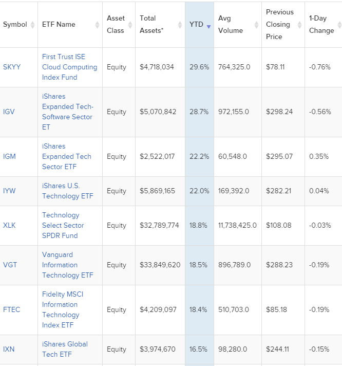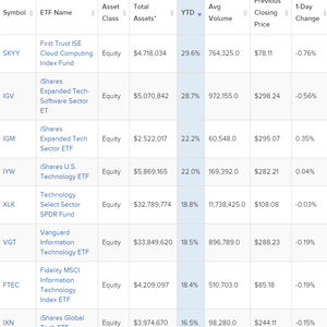 截至周一,例如First Trust 旗下、追踪云技术为主的ETF SKYY今年以来涨幅已经逼近30%;IGV今年以来的涨幅也已经超过28%;IGM、IYW两只ETF涨幅超过20%;XLK、VGT、FTEC和IXN等ETF今年以来的涨幅也超过了15%。