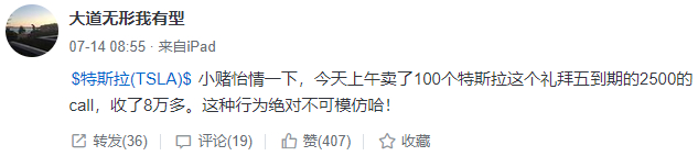 段永平在社交媒体上发表言论,称14日上午卖了100个特斯拉(TSLA.US)这个礼拜五(17日)到期的2500的call。