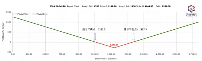 如图所示,持有一份straddle的总成本是$287.50,如果股价超过$1837.5或者跌破$1262.5,这个straddle模型就会盈利。反之,如果股价在$1262.5到$1837.5之间波动,投资者就会亏损,亏损的具体金额可以从上图看出,价格越接近行权价,亏损越大,最大亏损为$287.50。