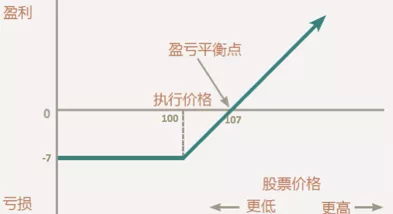 举个例子说,股票A的当前价格是99块钱,如果你以7元的价格买入一个执行价格为100的看涨期权,到期日是两周以后。那么,在期权合同结束之前的任一天,不论当天股价涨到了110还是220,你都可以选择以100元的价格买入股票A。也就是说,如果股价超过107元,你就盈利了。如果股价低于100元,不论是90还是50,你的损失都是7元。