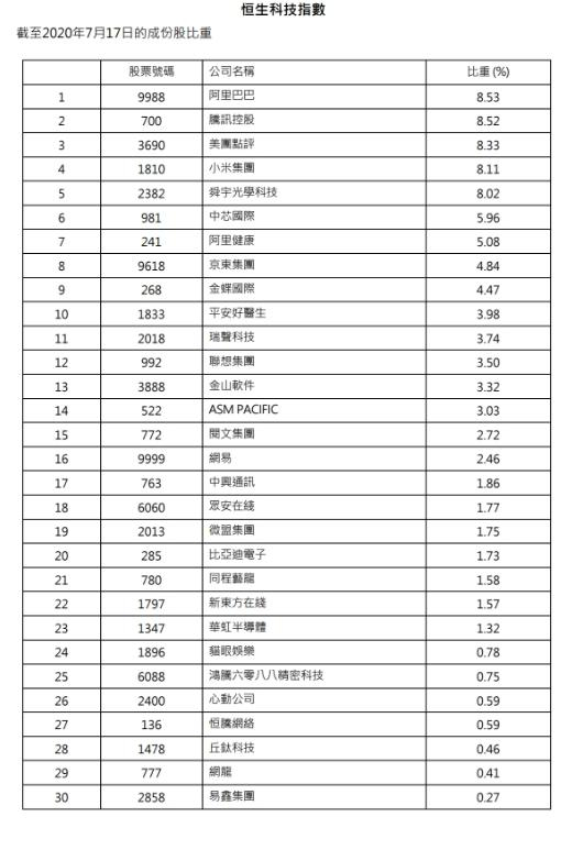 新浪港股讯 7月20日消息,恒指公司宣布,市值最大的30只科技股票将被纳入恒生科技指数成份股,其中包括阿里巴巴、腾讯控股、美团点评、腾讯控股等,阿里巴巴权重最高。假设新股上市当天收市市值在现有指数成份股中排名前10,该新股将被纳入指数。成份股加入一般于该新股上市后的第10个交易日收市后实施。