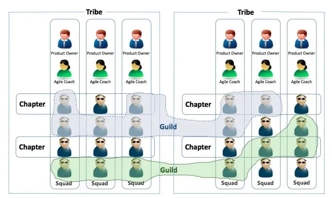 Spotify的研发组织分成了多个“Tribe部落”,分别负责共享的产品或顾客细分档案(音乐播放器、后台基础架构等)。每个部落的业务又被分成若干“Squad小队”(如搜索功能等功能特性小队、iOS等客户端APP小队、监控和运维等基础设施小队)。小队由5~7人自由组成,类似于一个“迷你的创业公司”,公司不任命管理者。他们对自己负责的那块产品进行改进、迭代以及发布更新版本。