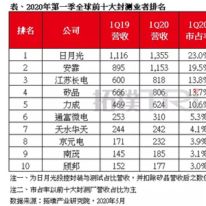 目前,OSAT产业已形成较稳定的竞争格局,根据集邦咨询旗下拓墣产业研究院发布的2020第一季全球前十大封测业者排名,日月光、安靠、长电科技位列前三,后面依次为矽品、力成、通富微电、华天科技、京元电、南茂、颀邦。从地区划分来看,全球前十大封测业者主要分布于中国大陆和中国台湾,其中中国大陆占据三席。