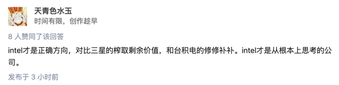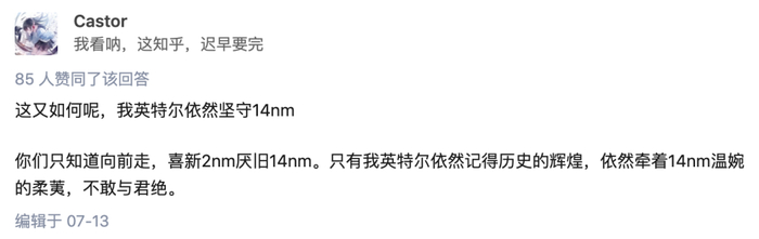 比起冲击新的制程,Intel依然坚守14nm。知乎用户@Castor 就表扬Intel对14nm的“专情”。