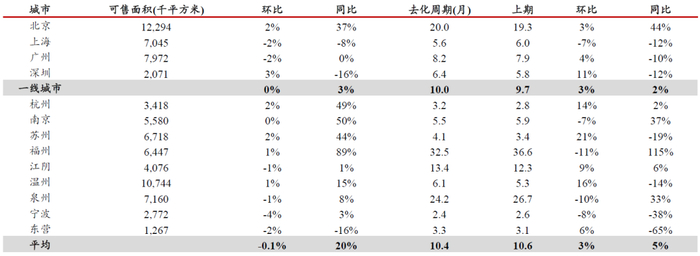 表 6:主要城市新房库存与去化周期情况,本周主要城市平均去化周期约10.4个月
