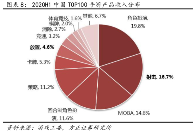 3、卫生事件红利下,头部厂商持续验证精品化战略,射击类、放置类等手游表现突出。20H1中国手游收入规模1047亿元(YOY+35.81%),增速大幅提升,占整体游戏市场的比例进一步扩大至75%。