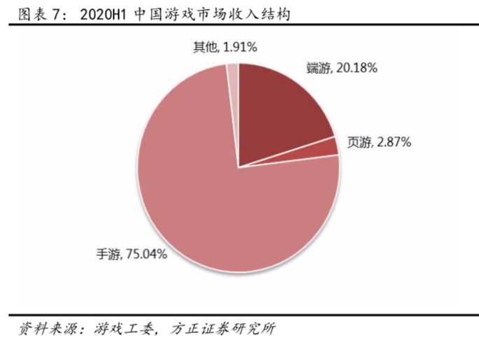 7月30日,游戏工委发布《2020年1-6月中国游戏产业报告》,20H1中国游戏收入规模1395亿元(YOY+22.34%),中国游戏用户规模6.57亿人(YOY+1.97%),中国自研游戏出海收入规模76亿美元(约人民币534亿元、YOY+36.32%);中国手游收入规模1047亿元(YOY+35.81%),占比75%。