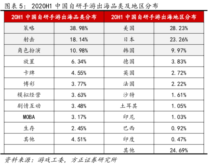 20H1中国自研游戏出海收入规模76亿美元(约人民币534亿元、YOY+36.32%),增速高于国内。